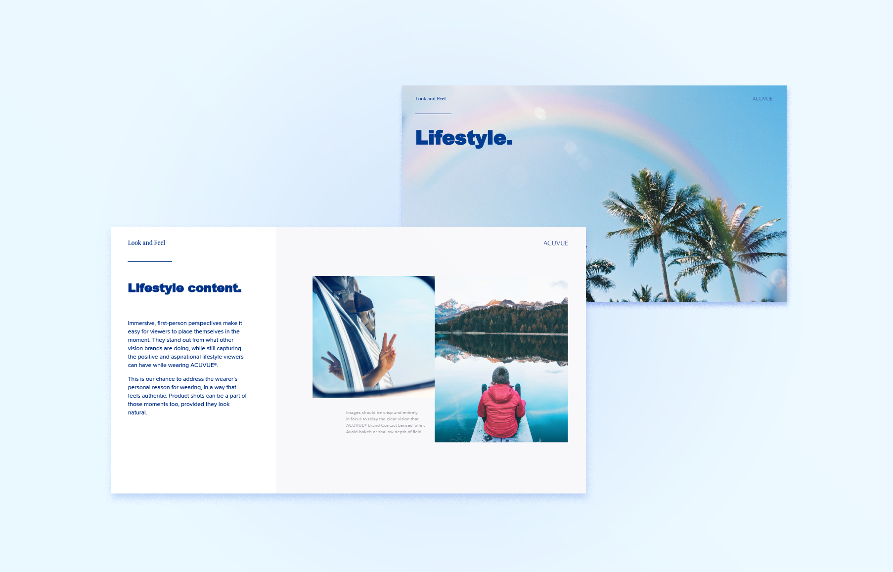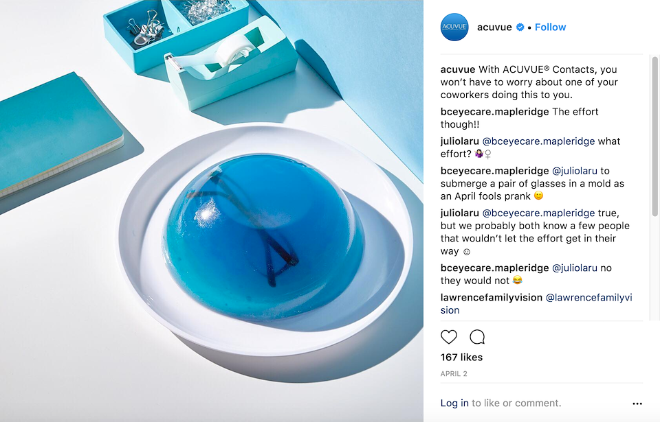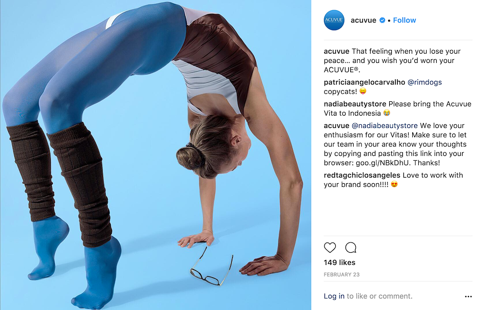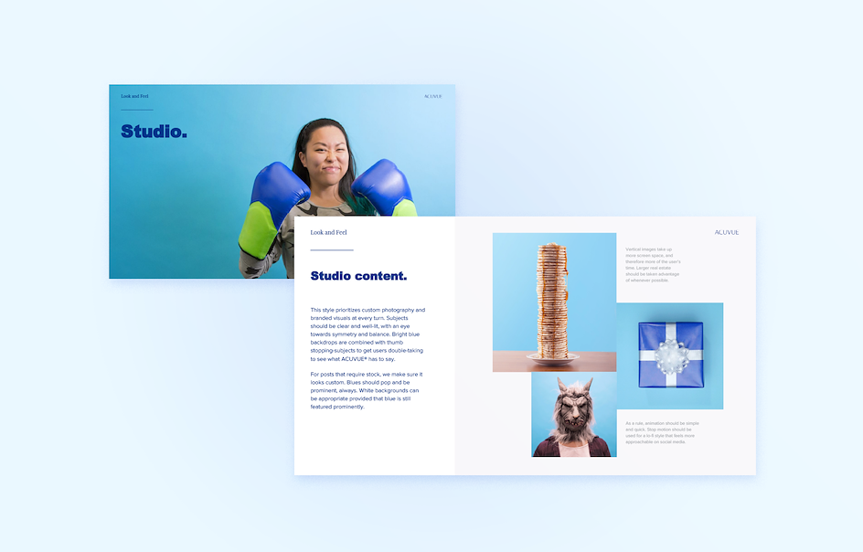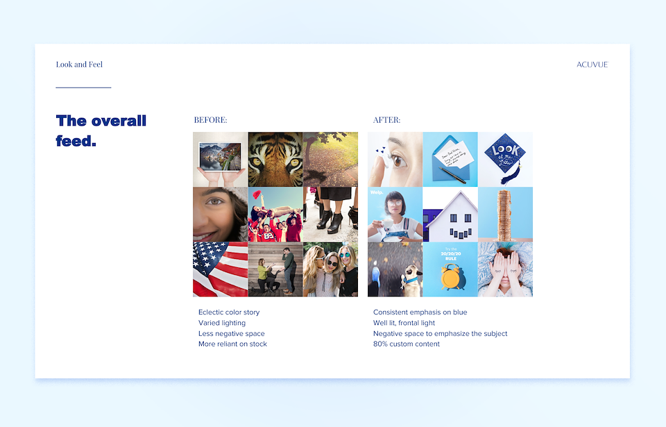 To define the tone of voice and look and feel of ACUVUE® Brand Contact Lenses on social media, the creative team put together a comprehensive social playbook. The new direction focuses on pairing bright, custom content with head turning subjects, immersive first person visuals, and clever copy—ACUVUE®'s way of drawing viewers in on an already crowded social media feed.