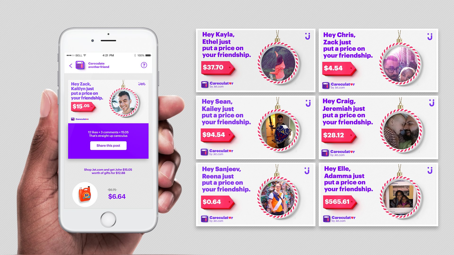 How? It used advanced “Careculus” to analyze the amount your friends’ like, comment, tag, and share your posts to literally put a price on your friendships. The resulting price can be shared with your friends through social. And of course, it also served up gifts you can get in that price range (for less) on Jet.com.